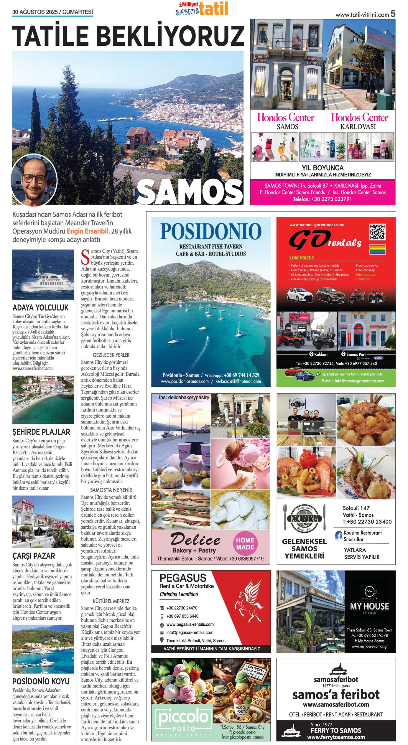 az tatili için Yunanistan’ı tercih eden Türk turistler; Kos adası başta olmak üzere; Leros, Kalimnos, ve Samos adasına yoğun ilgi gösterdiler.Bu olumlu gelişme kuşkusuz en çok feribot işletmecilerini ve adalardaki Yunan esnafını memnun etti. Bodrum-Kos hattındaki yoğunluğun Eylül sonuna kadar devam etmesi bekleniyor. Adalara yaz boyunca karşılıklı seferler düzenleyen Türk bayraklı feribot şirketleri de 2024 sezonunun bereketli geçtiğini ifade ettiler. Bu sene uygulamaya konulan kapı vizesi kolaylığı da Türk turistin komşu adalara yoğun bir şekilde ziyaret etmesini sağladı.